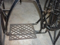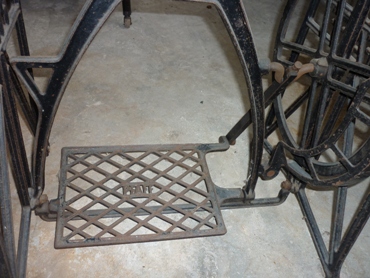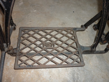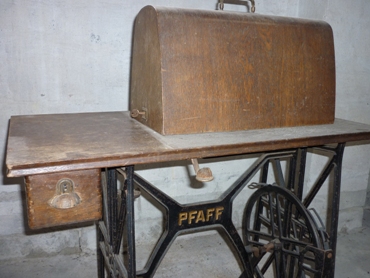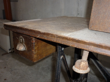 Gietijzeren kader met houten werkblad en een afsluitbare kap volledig mechanisch met voetbediening